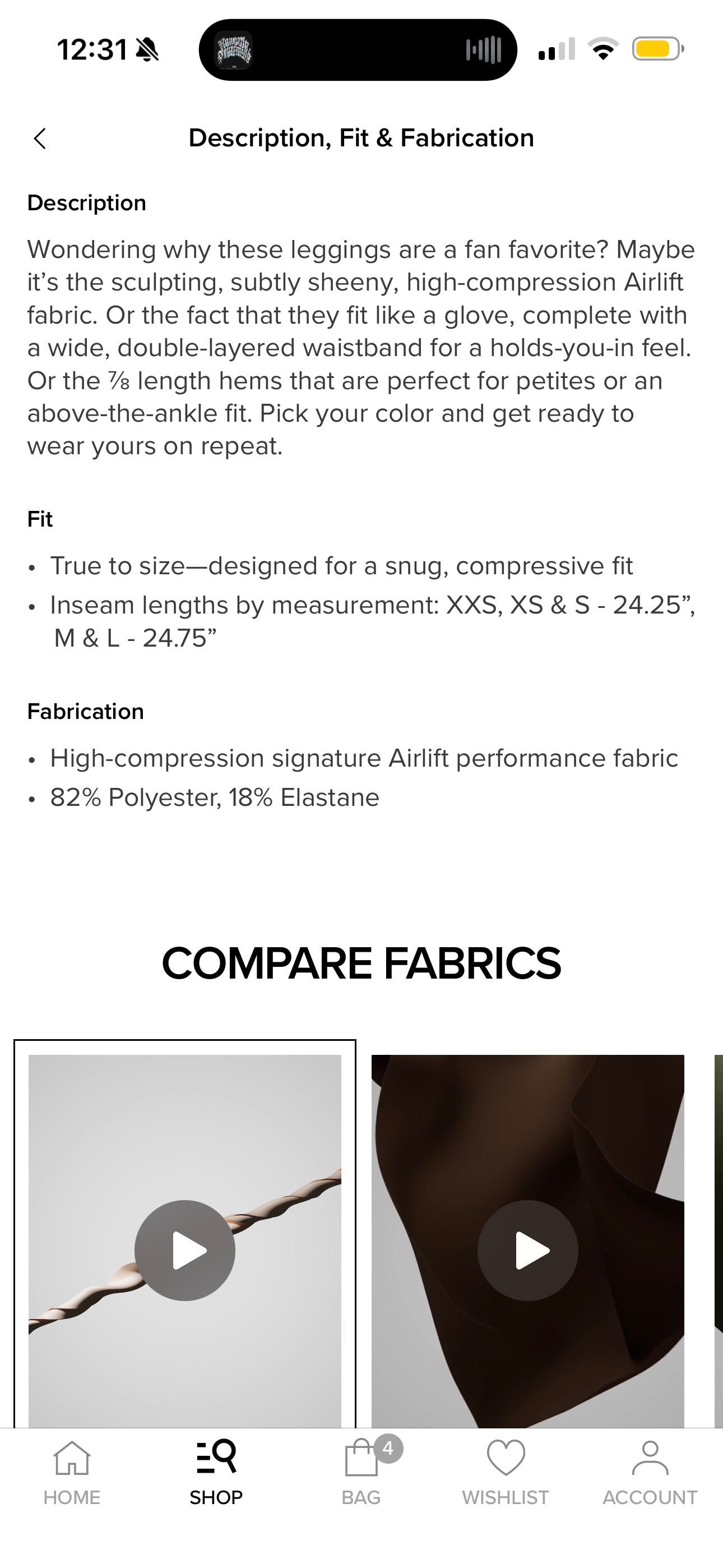 “These leggings are made from sculpting, subtly sheeny, high-compression Airlift fabric, designed to fit like a glove. The wide, double-layered waistband provides a holds-you-in feel, while the ⅞ length hems offer the perfect fit for petites or a chic above-the-ankle look”.