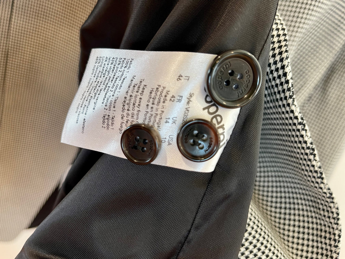 “Thinking about tailoring your wardrobe in a different direction? Smarten up for work, but don't lose your stylish edge with this houndstooth-check jacket from Coperni. Turns out smart doesn't have to be boring after all. Featuring notched lapels, stitched panels, a front button fastening, structured shoulders, long sleeves, button cuffs, a back slit at hem, slit details and applique detail towards the sleeve”.