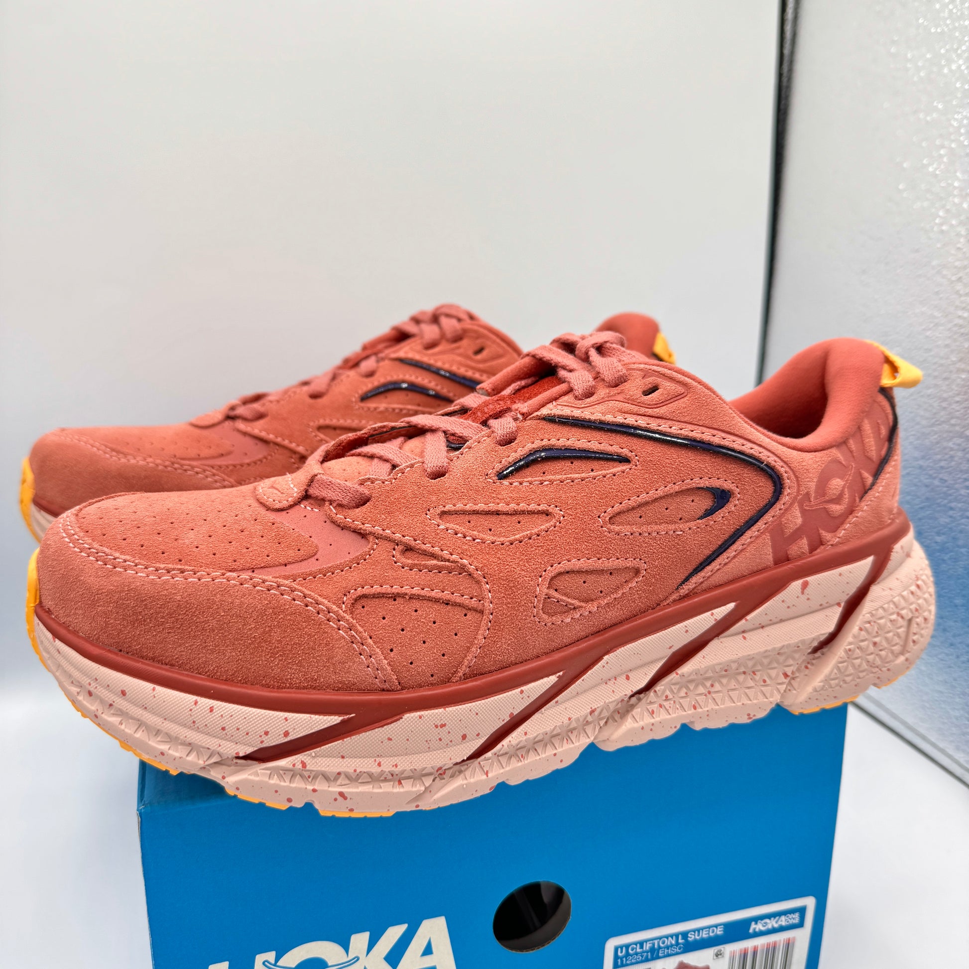 Hoka Clifton L Suede in Earthenware/ Hot Sauce Red Unisex Leather Sneakers